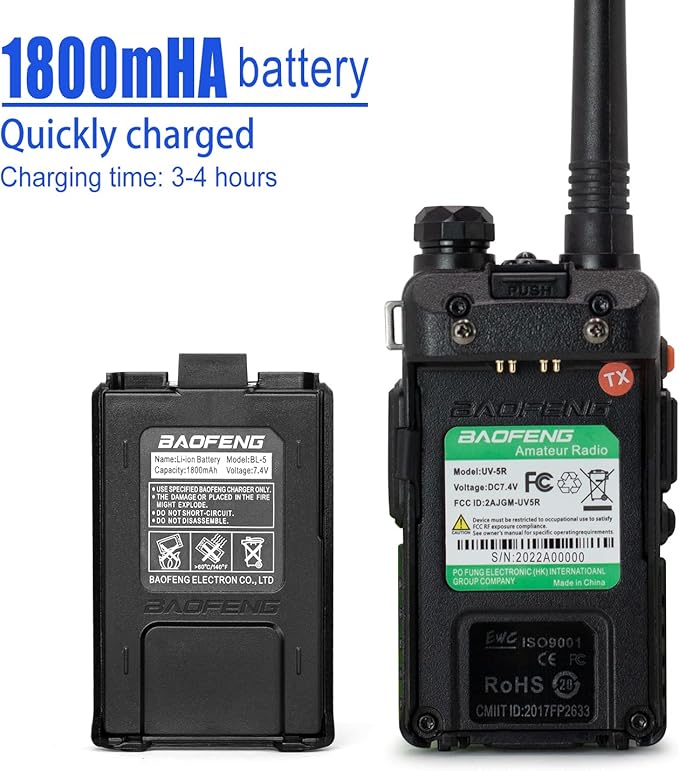 - ④ Extra battery: The BAOFENG radio comes with 2pack 1800mAH Rechargeable Li-ion Battery packs, support 24 hours continual communication, the charging time is about 3 hours.