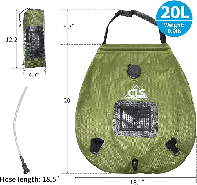- Sutekus camp shower is made of canvas, solid and durable. Can hold 5 gallons/20L of water for showering outdoor.