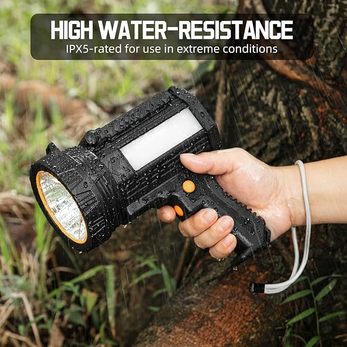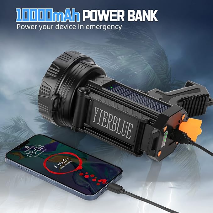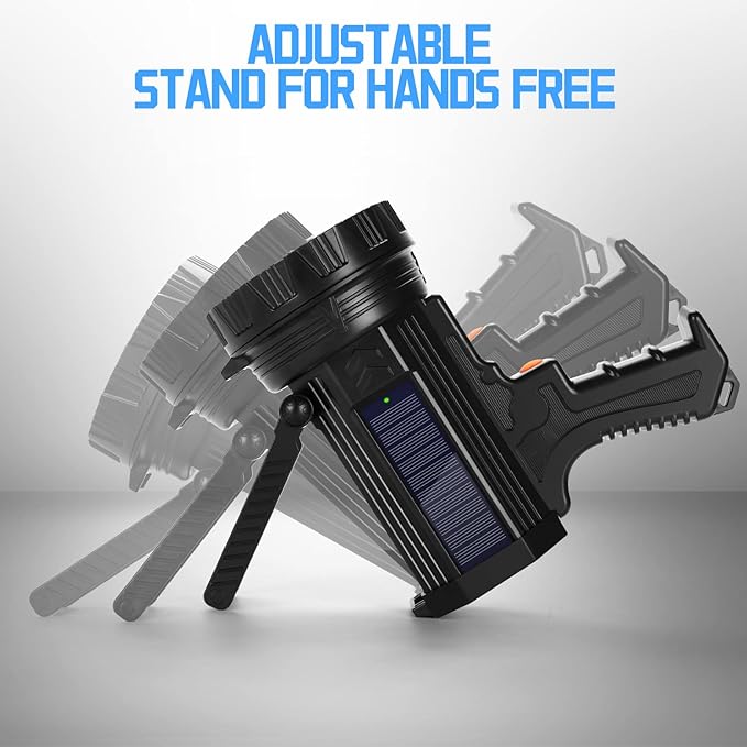 - USB C FAST CHARGING & SOLAR POWER: With advanced USB-C charging technology, recharge in just 4 hours. Compatible with any USB charging port, you can charge this handheld spotlight at home or in your car (charging adapter is not included). The high-efficiency solar panel can always replenish the power of the flashlight in time, so there is no need to worry about long-term power outages or battery power being exhausted.