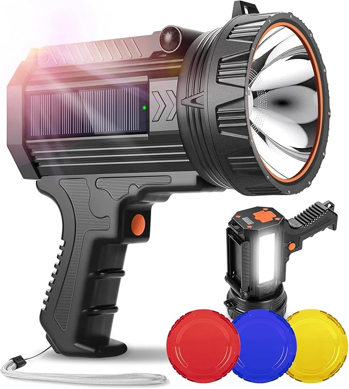 YIERBLUE Rechargeable Spotlight Flashlight with Solar Panels, 1000,000 High Lumen Outdoor Handheld Spot Lights and Flood Light, Foldable Stand and 3 Colors Lenses for Boating Hunting and Camping