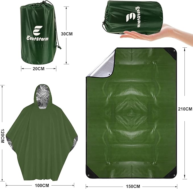 - 【Foldable & Portability】The overall folded size is 24*18*5cm and the weight is 600g, which is very convenient to carry around and put in a backpack or car trunk. The unfolded size is 210*150cm, which can easily cover two people, and one person can wrap the whole body. The unfolded size of the emergency poncho is 130*100cm, and the storage size can be held with one hand.