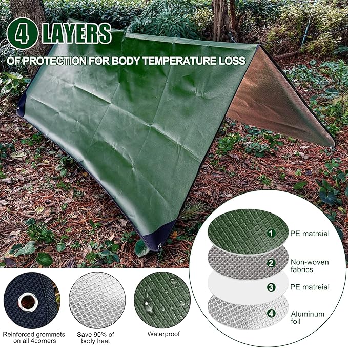 - 【4 Layers of Protection】This reflective emergency survival blanket is waterproof, windproof and has excellent heat retention. Made of non-woven fabric and polyester mesh combined with aluminum mylar coating. Better thermal insulation, more durable and less prone to damage than traditional single-layer mylar survival sleeping bag
