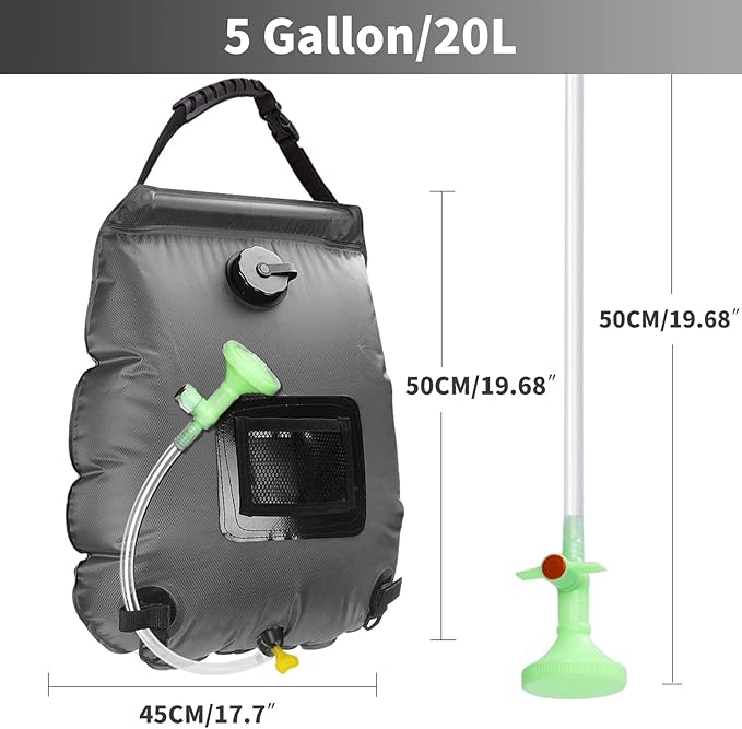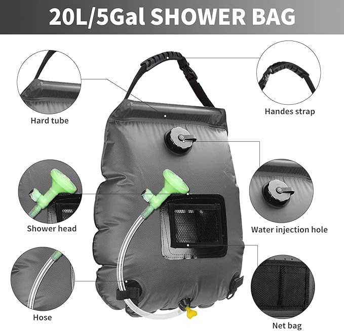 - LARGE CAPACITY - This portable shower for camping can carry about 20L (5 gallons) of water for outdoor shower washing, allowing you to easily wash away the dirt and fatigue on your body anywhere, and enjoy a different outdoor refreshing shower;