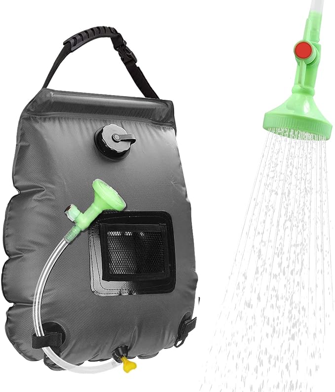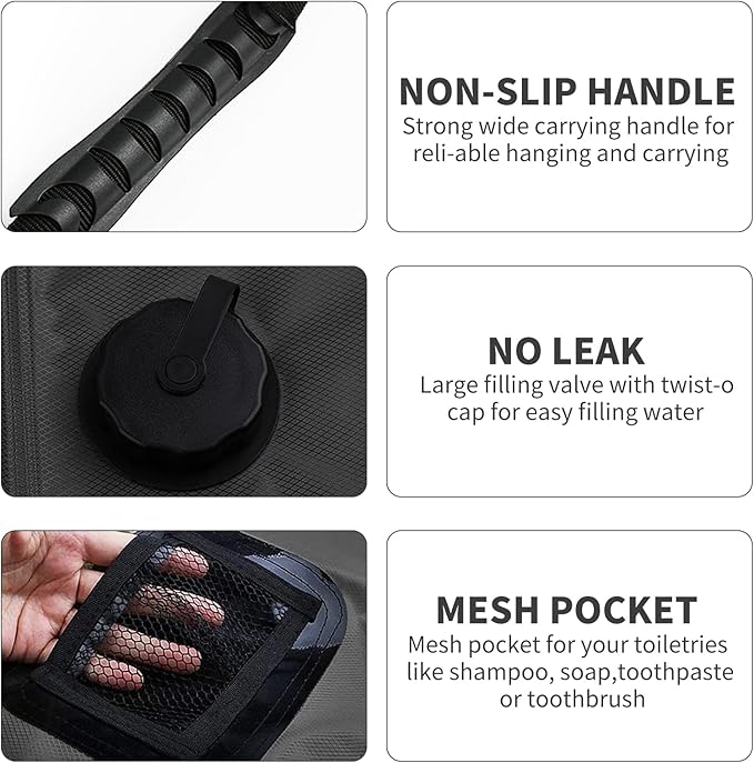 - RICH AND PRACTICAL ACCESSORIES - Our camping shower bag contains a hose, a shower head which we have upgraded and installed a convenient and practical ON/OFF knob, allowing you to easily control the water flowing; In addition, a practical mesh bag is sewn to hold some mini-travel essentials, such as small bottles of shower gel, shampoo, facial cleanser, razor, nail clippers, etc;