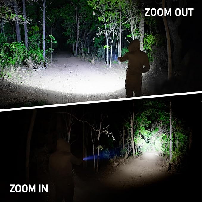 - 4 Lighting Modes and Zoomable: One button control of 4 lighting modes: High/Low/Strobe/SOS. The zoomable design adjusts the focus as needed, giving you the freedom to choose a spotlight or floodlight for long distances or larger illuminated areas
