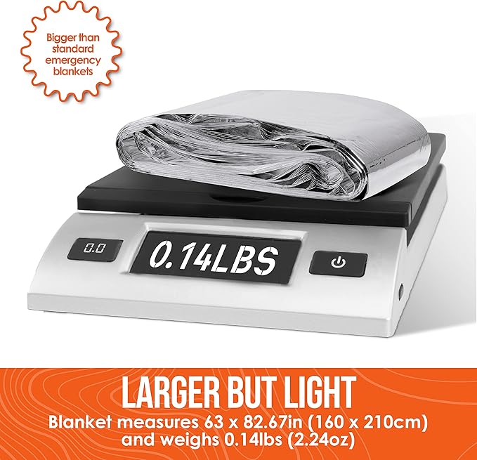 - Portable & Lightweight - Our large emergency blanket is compact which allows you to store it in your camping kit, survival kit, or car emergency kit!