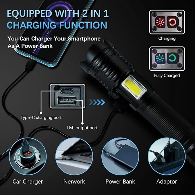 - 【USB C CHARGE & PWER BANK FUNCTION & OVER CHARGING PROTECTION】This powerful EDC flash light is built-in a high speed USB C interface, suitable charging by USB devices in indoor or outdoor activities, build-in a USB output interface, the flashlight can be used as a power bank. What’s different is equipped with upgraded overcharge protection, the flash light high lumens will stop charging when it is fully charged, so that we don't need worry about the safety when we forget it is in charging.