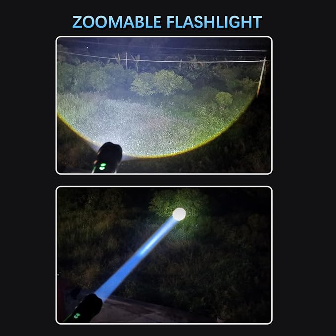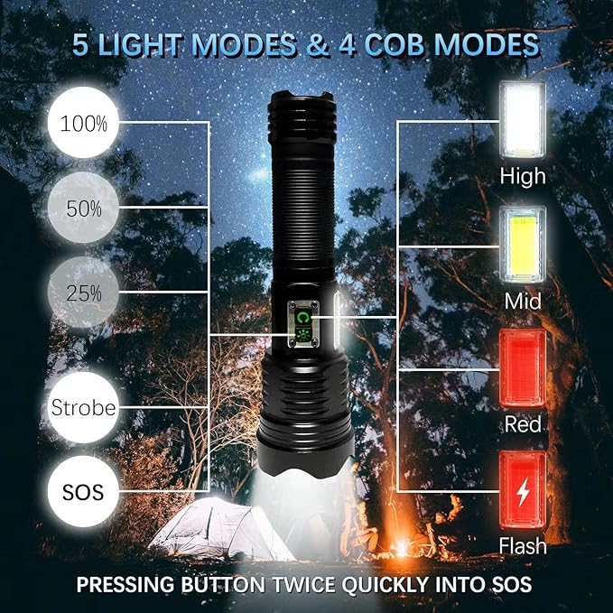 - 【ZOOMABLE & 9 LIGHTING MODES】The powerful handheld flashlight has 9 lighting modes. The main LED provides 5 modes: high-medium-low-strobe-SOS, the newly added side COB provides 4 modes: white high -white low -red -red flash. According to your needs and the environment you are, you can stretch the head to adjust the beams - spotlight or floodlight.
