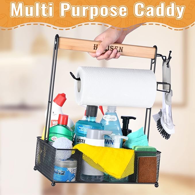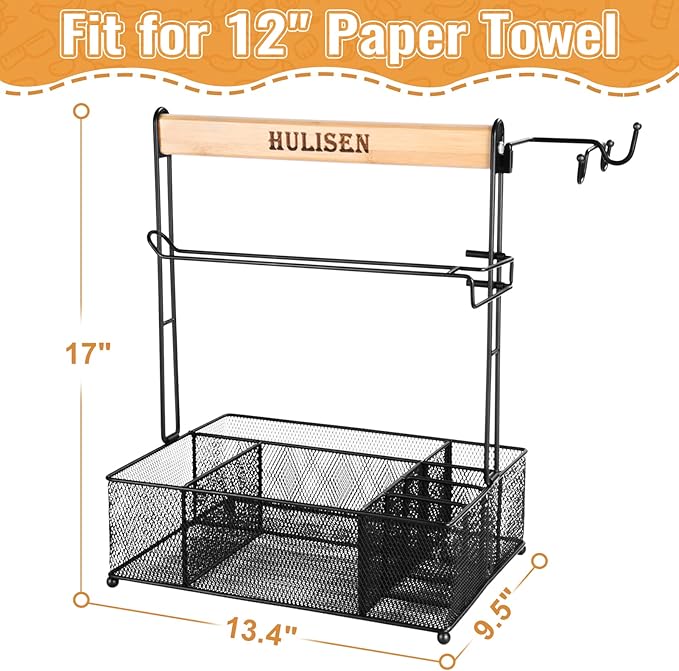 - Large Compact Storage: Wide base is divided into 7 compartments can easily keep utensils, spices, condiments, napkins, plasticware or cleaning supplies all together without taking up much space. Built in paper towel holder, fit for standard size kitchen paper towel. Come with utensil hooks, convenient in holding cooking and grilling tool. Keep all your supplies in one place. Easily take back and forth between kitchen and backyard table.