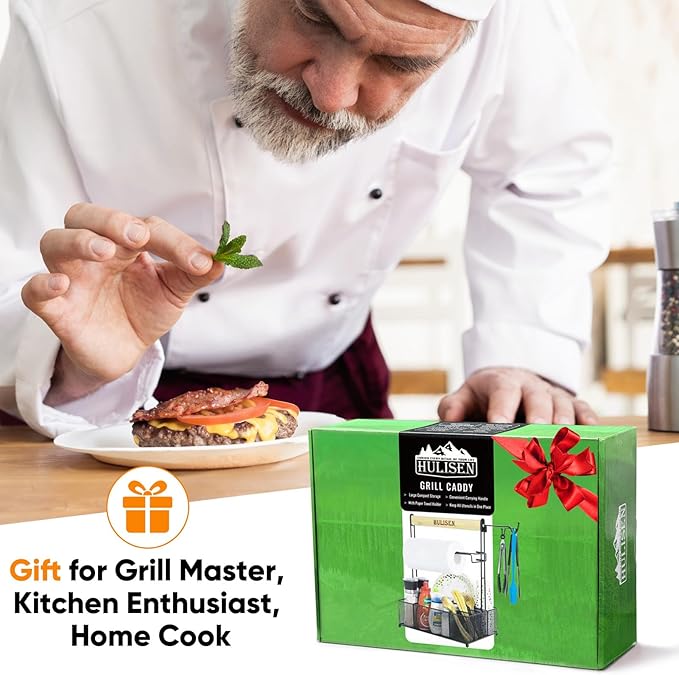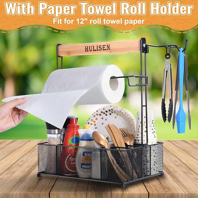 HULISEN Grill Caddy for Outdoor Grill, BBQ Caddy with Paper Towel Holder for Plates, Silverware, Utensils - Picnic & Barbeque & Camping Essentials Accessories for Tailgating, Camper, RV, Backyard