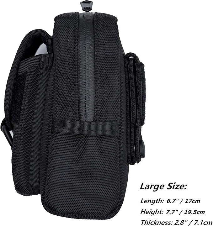 - LARGE SIZE: 6.7"(L) x 2.8"(W) x 7.7"(H). Weight:0.48lb / 220g. Fits up to 6.7" mobile phones. Made of 1680D nylon double-stranded Oxford cloth and double-layer PU coating to make the bag three-dimensional, with higher wear re sistance and better water re sistance. Note: Our logo on the front of pouch is attached to the Velcro tape inside, which can be torn off and you can apply your own patch or badge.