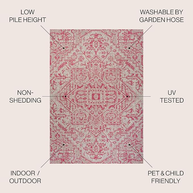 JONATHAN Y SMB105F-9 Estrella Bohemian Medallion Textured Weave Indoor Outdoor Area-Rug, Coastal Traditional Easy-Cleaning,Bedroom,Kitchen,Backyard,Patio,Non Shedding, 9 X 12, Light Gray/Fuchsia