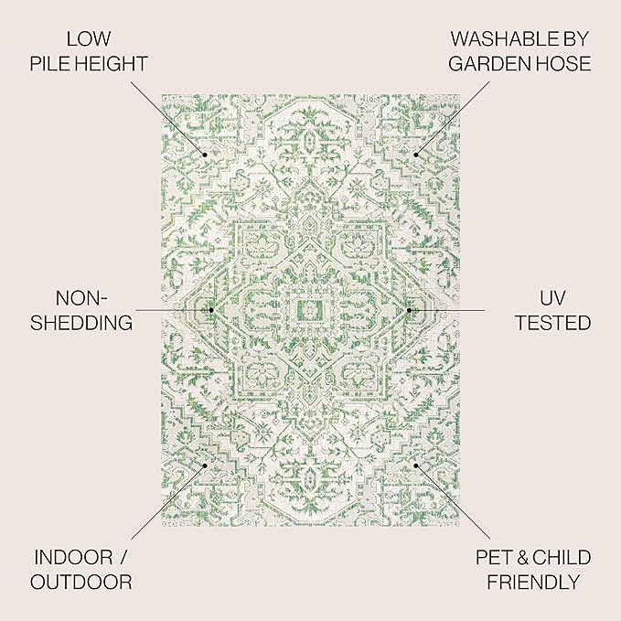 JONATHAN Y SMB105G-4 Estrella Bohemian Medallion Textured Weave Indoor Outdoor Area-Rug, Coastal Traditional Easy-Cleaning,Bedroom,Kitchen,Backyard,Patio,Non Shedding, 4 X 6, Green/Cream