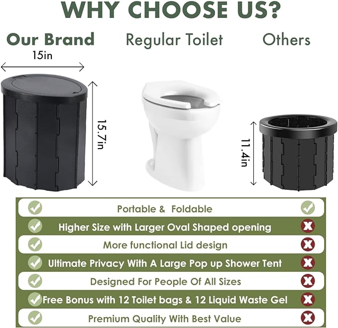- ✅ More Comfort With Large Portable folding Toilet- Higher and bigger size, more comfortable. We increased the height of this toilet to 15.75inch instead of the normal 11.8 inches products on the market, which is very suitable even for man use. In addition to this, We widened the seat cover, making you feel more comfortable when sitting