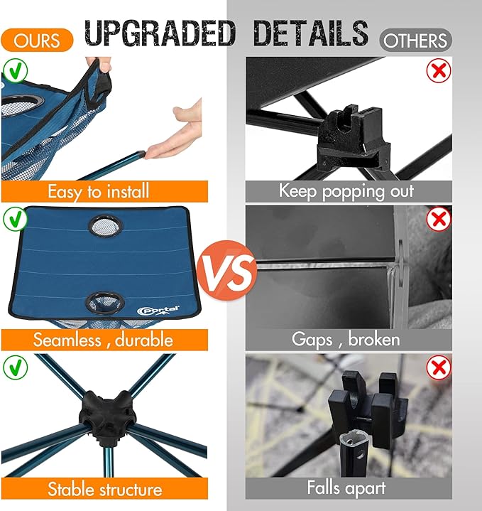 - Easy to Install and Upgraded Connecting Details: No tools needed! It only takes seconds to set up this camping table by unfolding the legs into place and then attaching the tabletop. Unlike other tables, the top is difficult to stay attached to the legs, and the hinges are easy to break. Compared to that, our portable table design is much more persistent and long-lasting