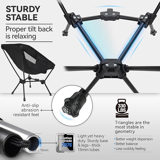 - Superior Comfort: Proper tilt angle allows you to lounge comfortably in this chair while maintain a normal sitting posture to chat with friends. Triangular base distributes weight evenly, keeping gravity balanced without wobbling. Ripstop polyester seat and robust aircraft-grade aluminum frame ensure long-term use.