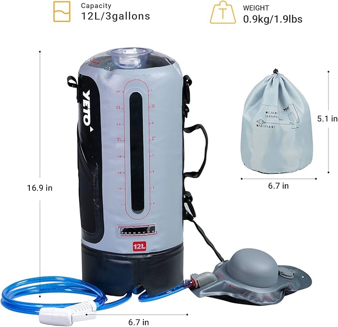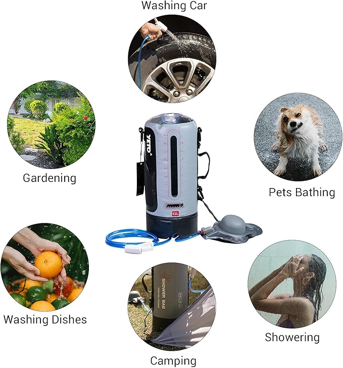 - 🚿 New Version Outdoor Shower: Portable shower bag for camping can carry up to 3.17 gallons/12L of water, allowing you to enjoy a great outdoor shower. And This solar shower bag equipped with a temperature and water level window for monitoring real-time volume, you can quickly know the water temperature.