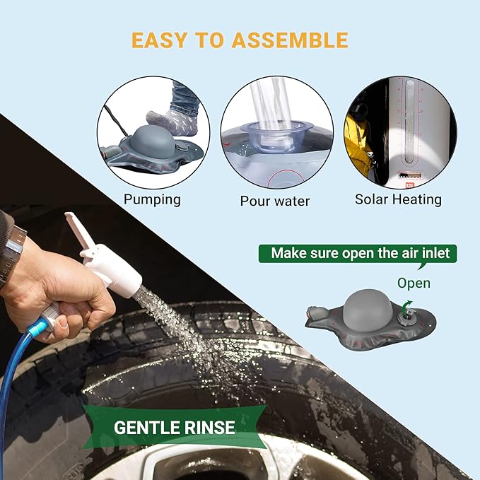 - 🚿 Handy Nozzle with Two Modes: This camp shower nozzle provides two flow modes for a comfortable bathing experience. Keep pressing down and let the water flow. Pull up the switch and get the continuous water, you can easily turn on the shower nozzle by hand after using soap. Absorbs sunlight for warming the water, in direct sunlight, the water can be heated to 127°F (53°C) in 3 hours, Which can bring you a comfortable outdoor hot tub or store clean water.
