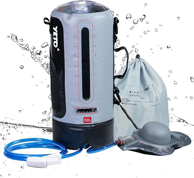 YETO 12L/3.17 Gallons Portable Camping Shower Portable Shower for Camping Camp Shower Solar Shower Outside Shower with Pressure Foot Pump and Handy Nozzle Camping Showers Camping Shower Bag, GREY-12L