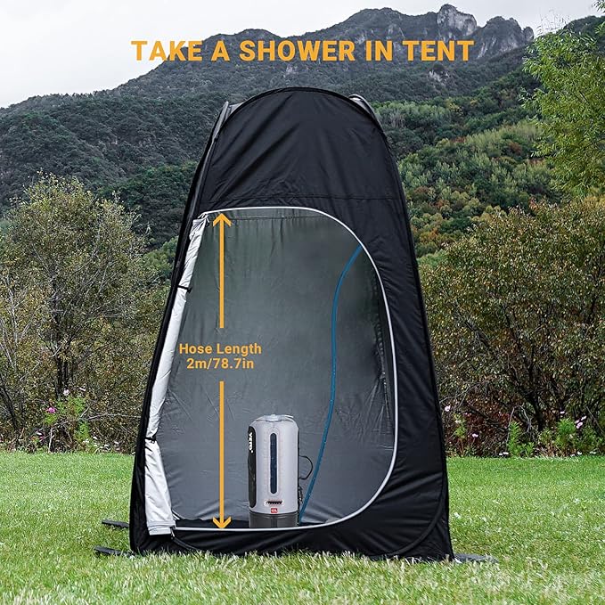- 🚿 Upgraded Foot Pump: The new foot pump is upgraded, which is more convenient, and the water flowing is faster and more stable.updated check valve, water will not flow back to the pump. The foot pump pressurizes the water tank to give a long powerful spray and get a comfortable high-volume rinse. Stepping on foot pump a few times can hold water for 30 seconds, and a whole tank can last about 6 minutes shower.