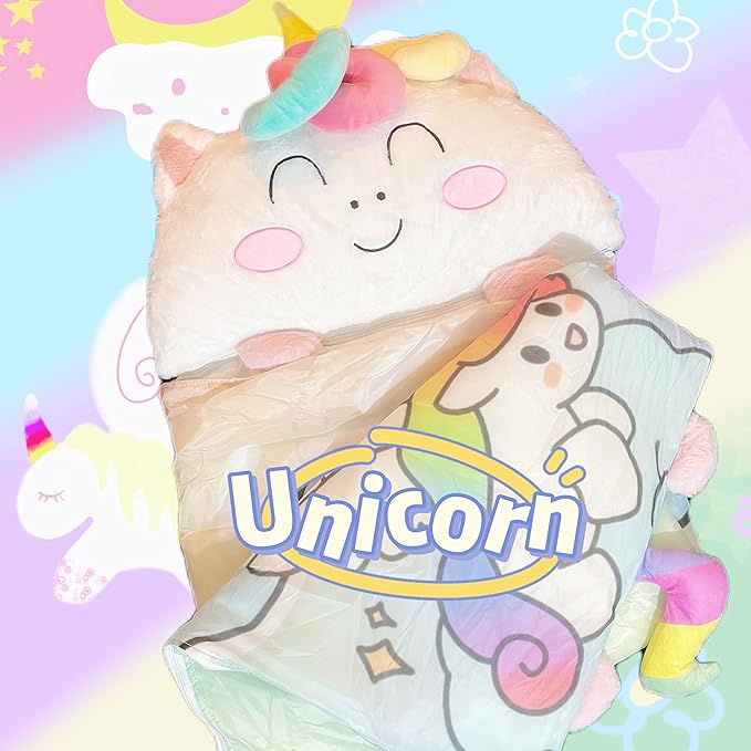 - Adorable Unicorn Design: Features a magical unicorn theme with a rainbow-colored sleeping bag and a plush pillow, perfect for kids who love fantasy and fun