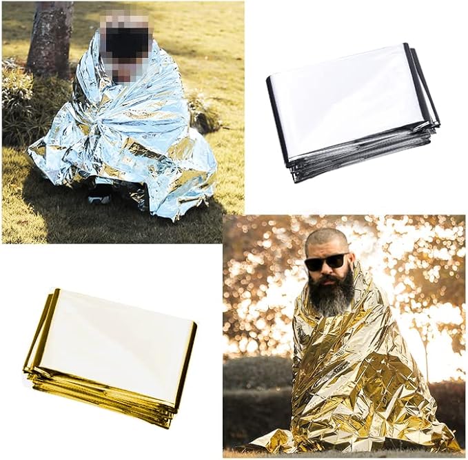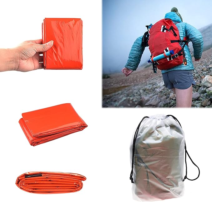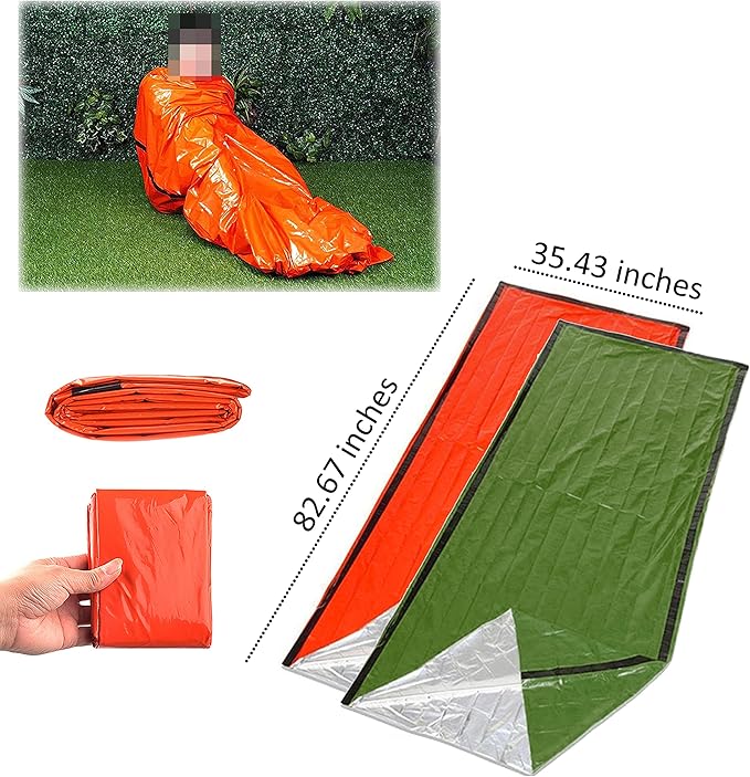 - EMERGENCY SURVIVAL ITEMS ⭆ A survival gear is an essential part of emergency supplies if there is an outdoor emergency or if there is a need to suddenly leave your home. The pack includes 2x emergency sleeping bags (orange/green), 2x survival tents(silver), 4x survival blankets (gold/silver), 4x whistles, 4x storage bags.