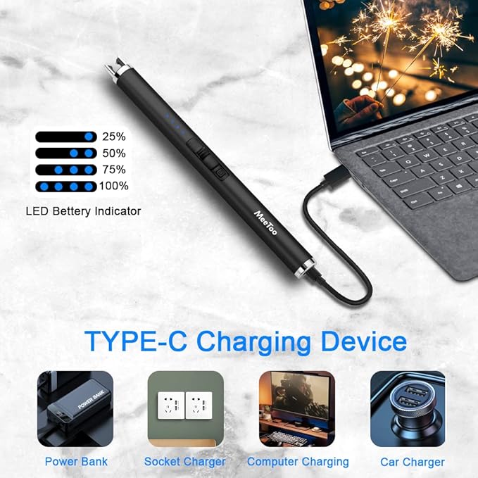 MeeToo Candle Lighter Electric Lighter Rechargeable USB Type-C Lighters for Candle BBQ Camping Fireworks (Black)