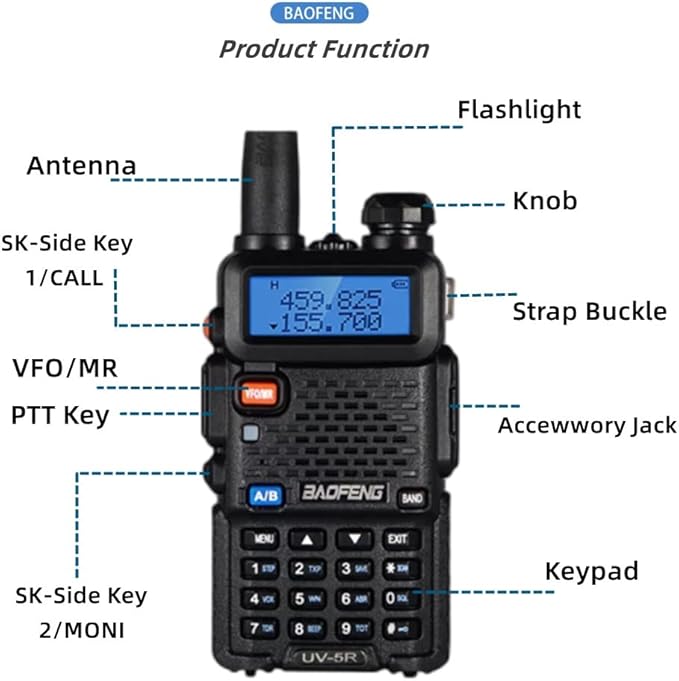 - Practical functions: Dual frequency. Display, Dual Standby, A/B Band Independent Operation, VOX, Busy Channel Lock, Scan, Built-in LED Torch, Emergency Alarm, etc.