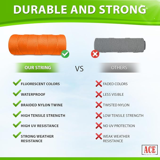 - Strong string - This thick string is made of high quality nylon, which is stronger than polypropylene twine. The braided design allows this marking rope to hold up through the harshest conditions!