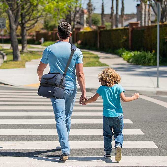 - Insulated Lunch Bag ---- The thick inner insulation and food-grade safe PEVA liner retain coldness or warmth, it can keep food stay cold/warm/fresh for hours, the heat-welded seams to guard against leaks; Easy to wipe clean. Top section interior size is 9.45L*7W*5.5H inch, Bottom section interior size is 9.45L*7W*4.7H inch