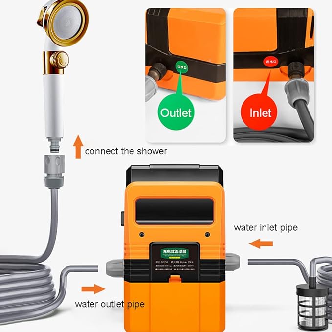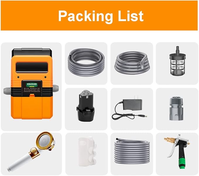 - Complete accessories: The multifunctional high-pressure water pump has complete accessories, including shower self-priming pump, 4M water outlet pipe, 2M water inlet pipe, water inlet filter, battery, charger, quick connector, shower head, shower suction cup hook, 10m water pipe, car wash water gun . Can meet your different water needs!