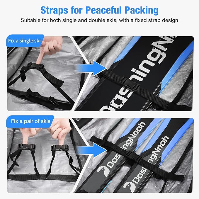 - STRAPS FOR PEACEFUL PACKING: Equipped with an internal dual-strap binding system, the padded ski bag securely holds a snowboard or two sets of skis. The sturdy buckles ensure a snug fit, preventing your skis from knocking against each other during transport