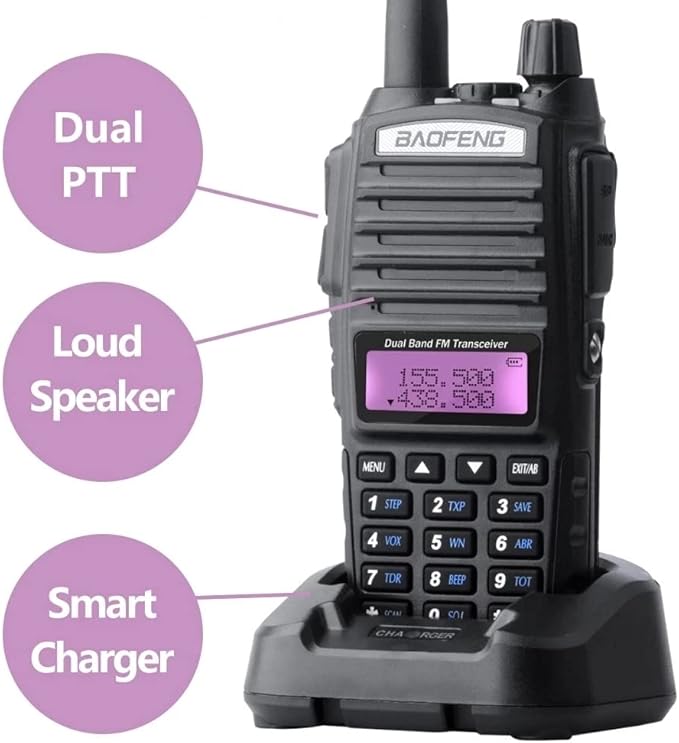 - [BAOFENG UV-82 Radio]: High/Low Power(5W/1W); 128 channels; VHF/UHF;7.4V/1800mAh Li-Ion battery, LED Flashlight, Power Saving.FCC ID: 2AJGM-UV82