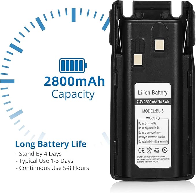- [Rechargeable Battery]: With 1800mAh Li-ion battery, this radio can be fully charged in 4-5 hours with the charger. After being fully charged, this radios can be stand by 4 days,continuous use 5-8 hours