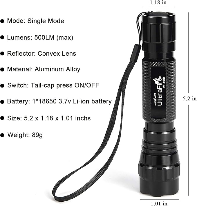 - LONG-LASTING: UltraFire WF-501B max 500 Lumens flashlight, Ultrafire LED bulb, 100,000 hours lifetime. Ensure your home and outdoor activities are hassle-free every day.