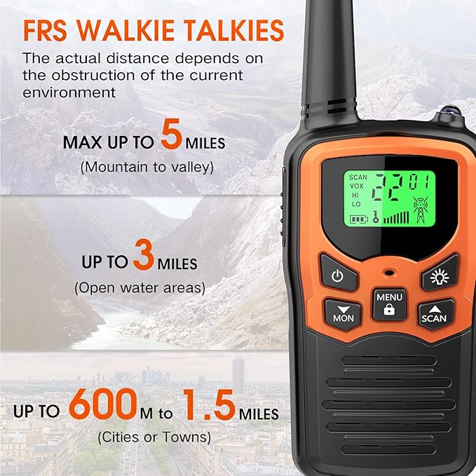 Walkie Talkies with 22 FRS Channels MOICO Walkie Talkies for Adults with LED Flashlight VOX Scan LCD Display, Long Range Family Radios for Hiking Camping Trip (Orange, 4 Pack)