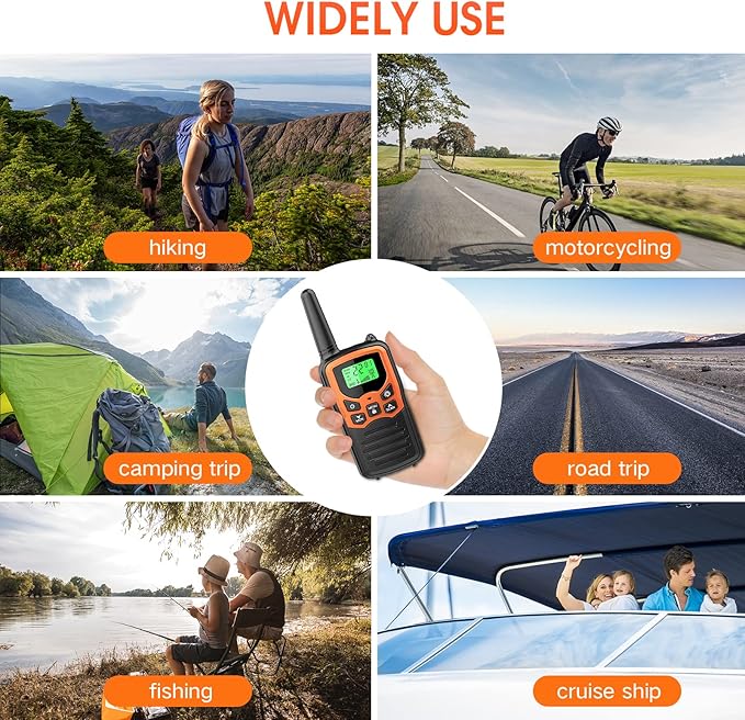 - Lightweight, Wide use: Small size and light weight, hard and durable shell, drop-proof. easy voice and sound activation transmission (VOX) with 3 sensitivity levels for hands-free operation,this walkie talkies provides long range communication and clear sound for hiking, biking, camping trip, road trip, cruise ship and so on. The walkie talkie is also a great communication tool for adults and the elder to talk to others at home.