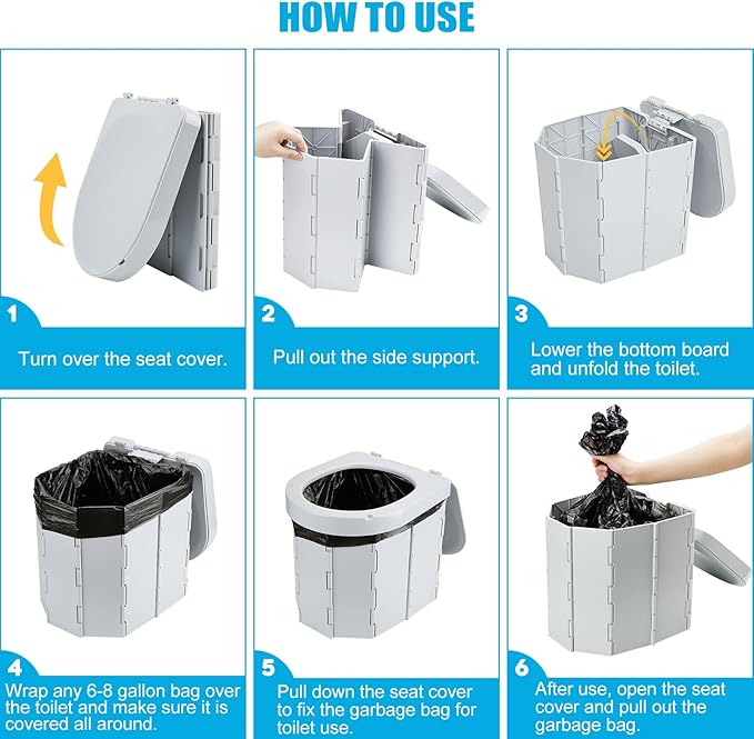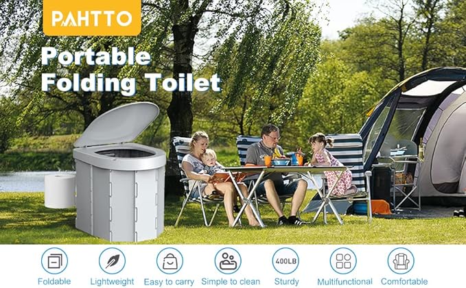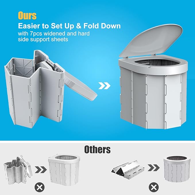 - 【Easier to Use and Portable】PAHTTO folding camping toilet is further updated to be easier to set up or fold down in seconds, particularly as it has only 7 side support sheets, while others on the market have 12. Coming with a waterproof storage bag, it can be conveniently packed into your bag without taking much space. Wrap any 6-8 gallon bag then you can use it anywhere and anytime.