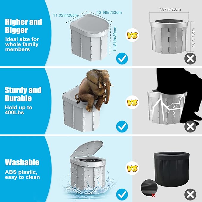 - 【Sturdy and Comfortable】Our portable toilet for camping is more comfortable with a higher and wider seat compared with those round ones in the market. Made of premium ABS plastic, it is washable and sturdy to bear up to 400lbs, suitable for both adults and kids.