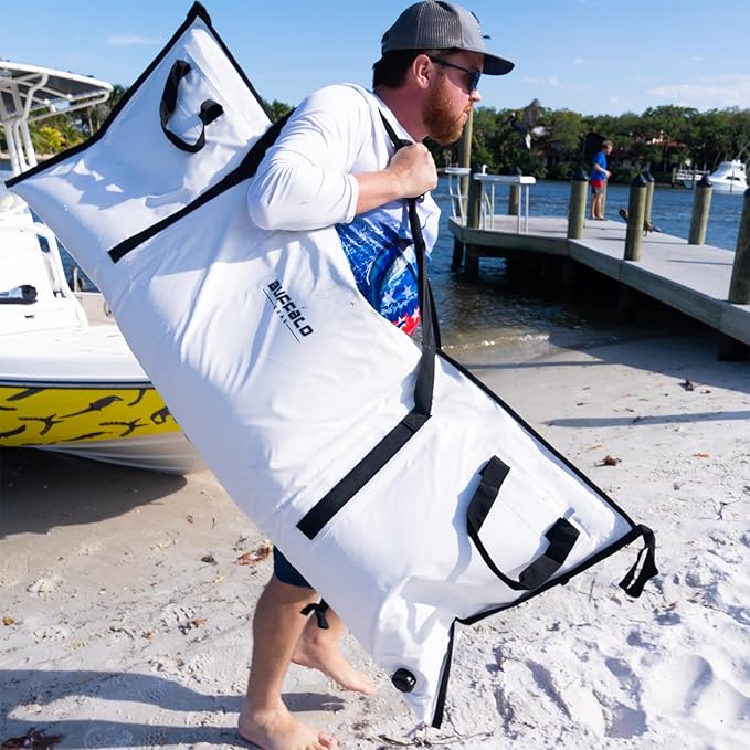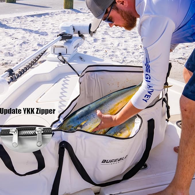 - COMPACT & CONVENIENT: The Buffalo Gear monster fish bag 60x24 inch with very thick walls, YKK zipper and sturdy straps. high quality and easy to pack on the boat instead of a big bulky cooler, takes up less space in boat