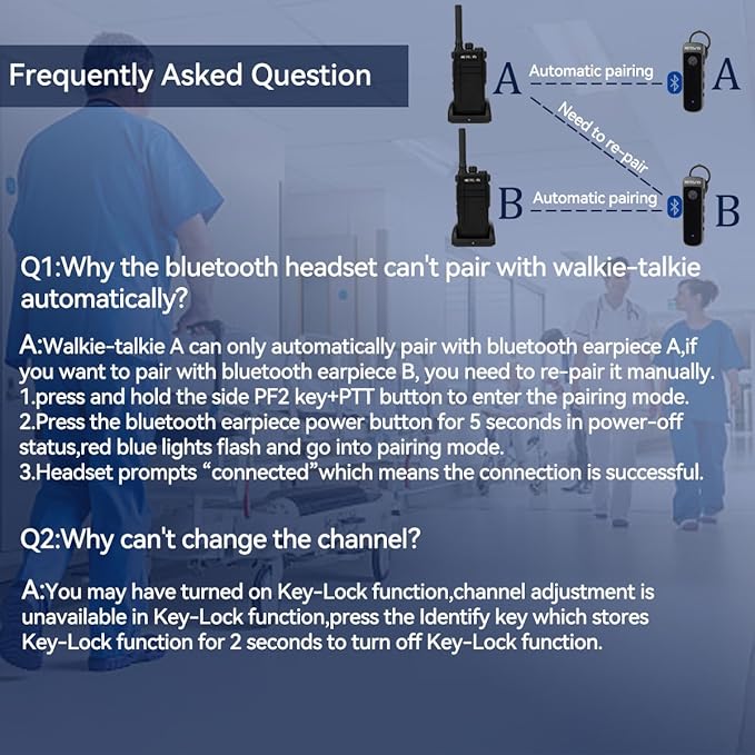 - RB37 walkie talkie and bluetooth earpieces have been paired and are ready to use out of the box; after turning on; earpiece will automatically reconnect; solve the trouble of re-paring;which save time and improve efficiency