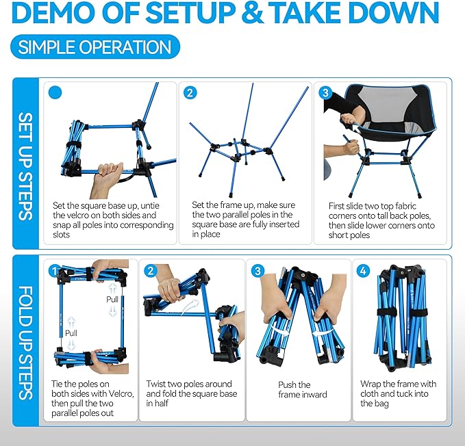 - Simple Assembly: Shock-cord structure enables quick set up, poles basically pop into place on their own, then just slide the fabric seat onto 4 poles. Two Velcro straps help to fold up easily so you can tie the poles together on one side first and then the other side. It's easy after a bit of practice.