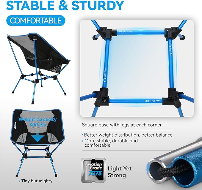 - Stable and Durable: Solid square base makes the chair more stable and sturdier. The four horizontal bar and four stand-alone legs disperses the weight over multiple poles and provides more balance when sitting. Ripstop polyester fabric and robust aircraft-grade aluminum alloy frame supports up to 300 lbs.