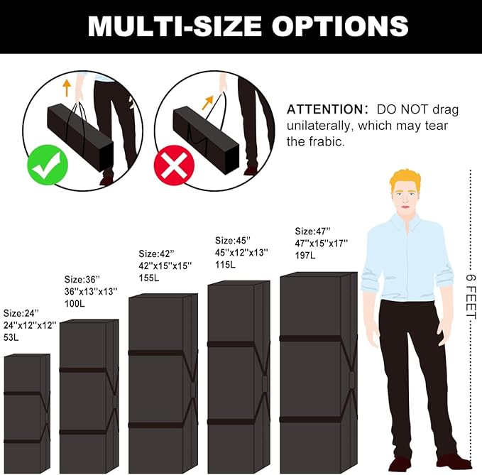 - Easy To Transport and Store: When not in use, duffel bag folds into a flat, compact size for easy storage, taking up no space. Long duffle bag has plenty of room for storing items, good for travel and use as tent bag, camping bag, cargo bag, gear bag, overnight lightweight bag, and equipment bag for all sports. Tote travel bag comfortable and convenient to carry on, and the perfect size for the seat in the car or plane