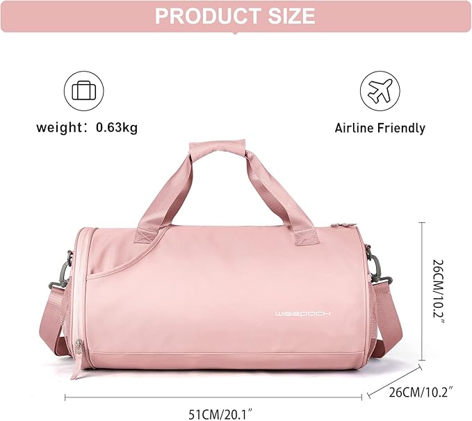 - Duffle Bag Size: This women's size: 26CM*51CM*26CM/10.2*20.1*10.2", weight: 0.63KG. This women's gym bag is perfect for fitness ,traveling, sports and exercise. The gym duffle bag can be either a handbag or a cross body gym bag, the detachable and adjustable shoulder straps make it easier for you to change your carrying style