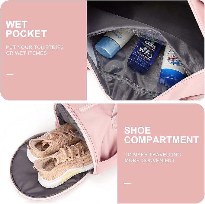 - Multi Pockets Gym Bag: Our gym bag has 9 pockets including 1 spacious main compartment with 3 small inside pockets, 1 front pocket, 2 side pockets, 1 wet pocket and 1 dedicated shoe compartment.Perfect for carrying sports gear, dirty clothes, shoes and even toiletries. The multiple compartments of the women's gym bag keep your belongings organized and allow you to quickly find what you need