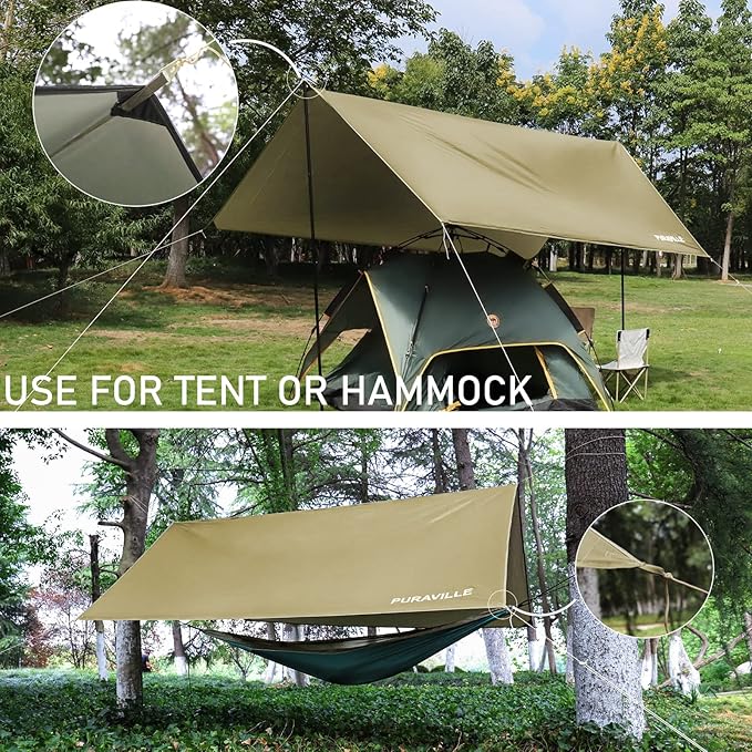 Puraville Camping Tarp Waterproof, Hammock Rain Fly Tent Tarp - 10 10 ft Rectangle Lightweight Camping Tarps, Portable Rain Fly for Camping Backpacking (Khaki)