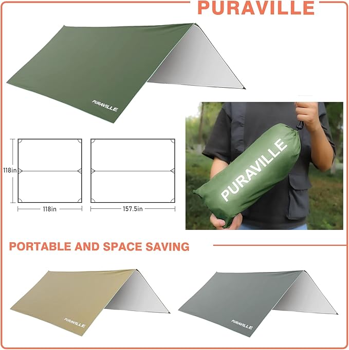 - A PERFECT SHELTER FOR OUTDOOR ADVENTURE: Are you struggling to pick the best backpacking tarp from a dazzling numbers of choices? Let Puraville be your first choice! Our camping tarp will provide you a cozy shelter in the wildness within minutes, protect you from the sun, snow, rain, or wind when enjoying the beauty of nature.