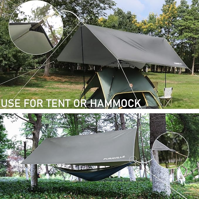 - A PERFECT SHELTER FOR OUTDOOR ADVENTURE: Are you struggling to pick the best backpacking tarp from a dazzling numbers of choices? Let Puraville be your first choice! Our camping tarp will provide you a cozy shelter in the wildness within minutes, protect you from the sun, snow, rain, or wind when enjoying the beauty of nature.