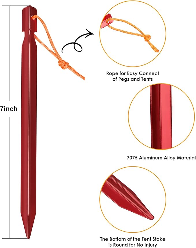 - 4. [ No ACCIDENTAL INJURY ]: The bottom of the ground nail is round rather than sharp, and the aluminum tent stakes has a comfortable grip, which can effectively avoid accidental injury.